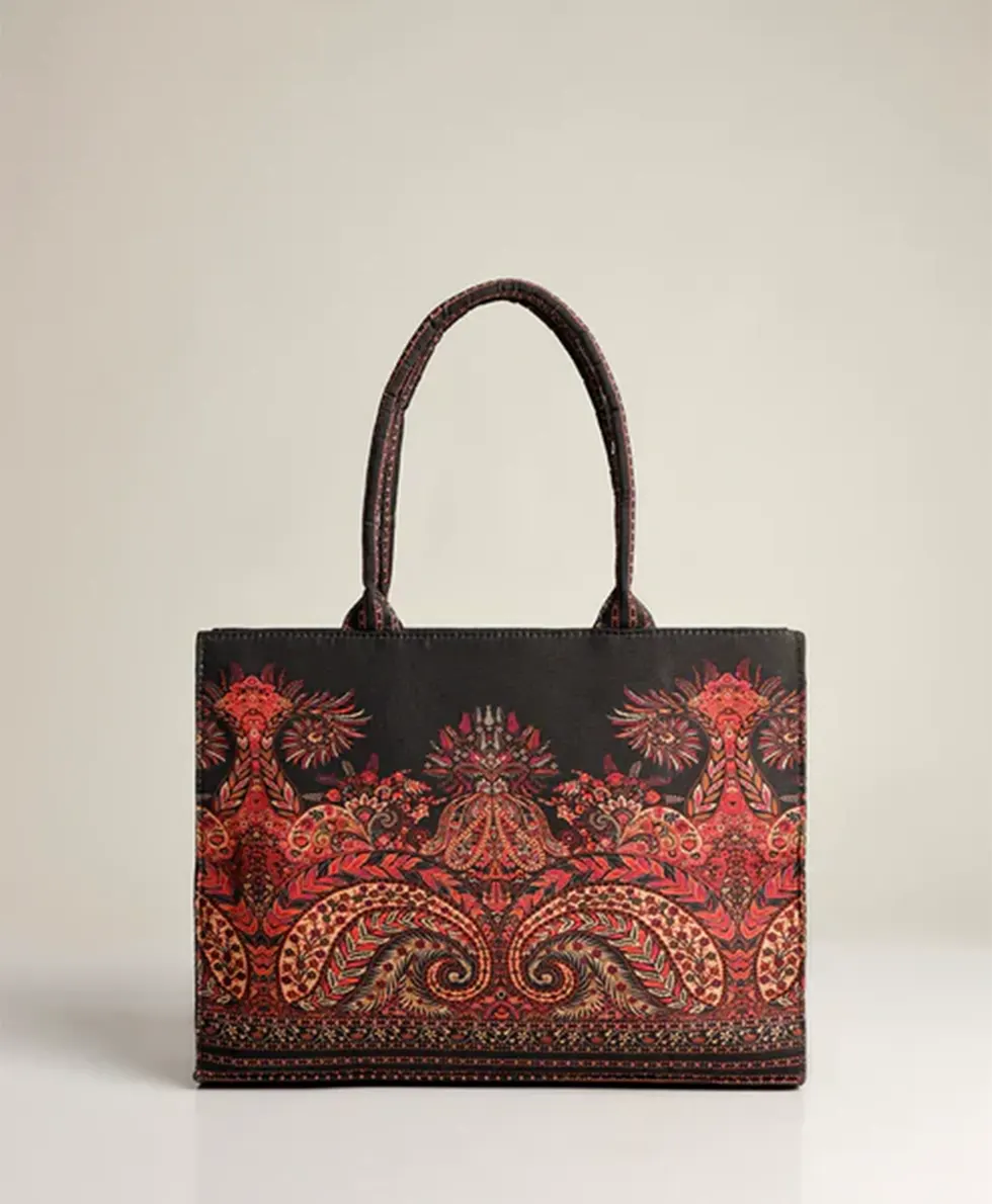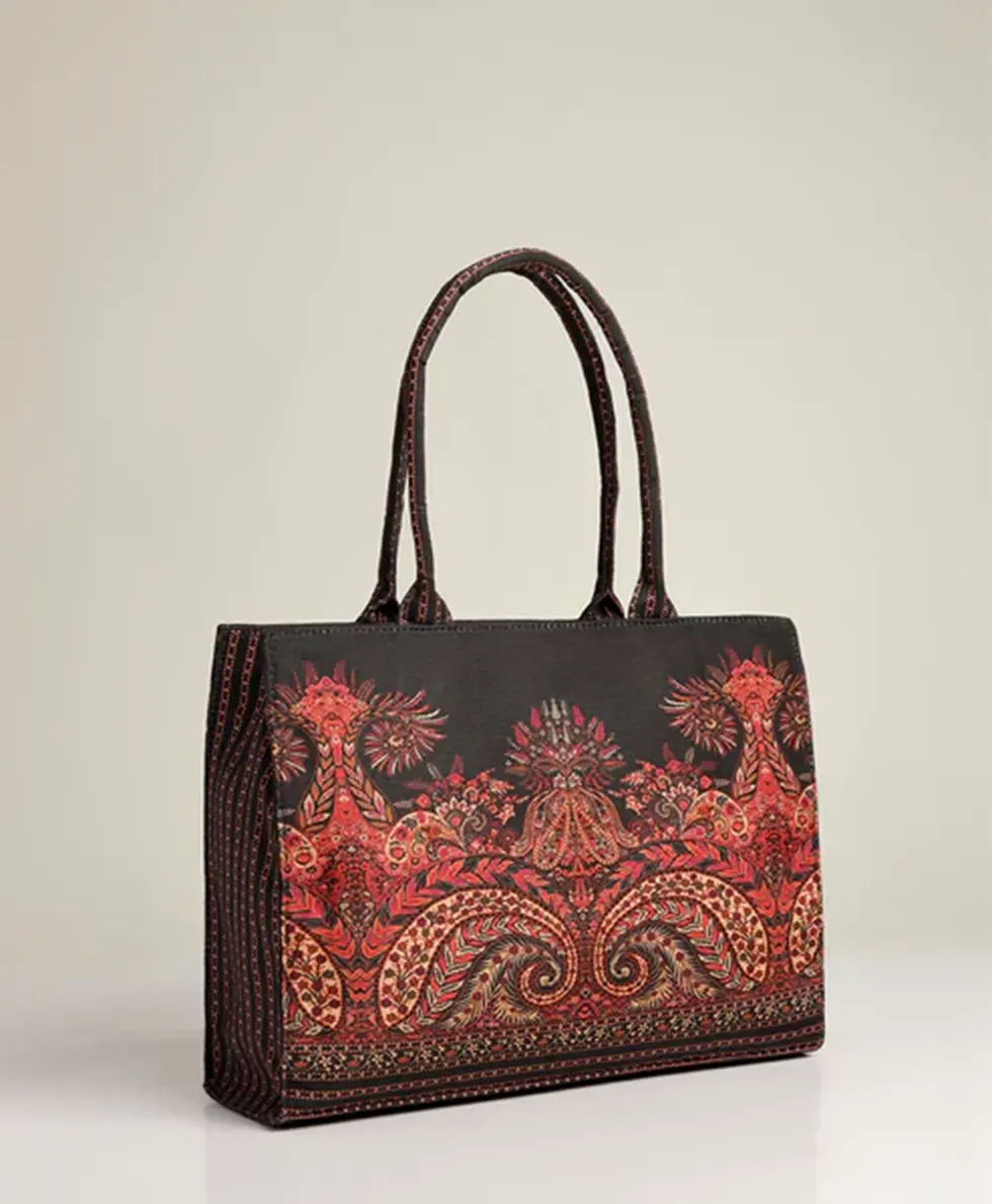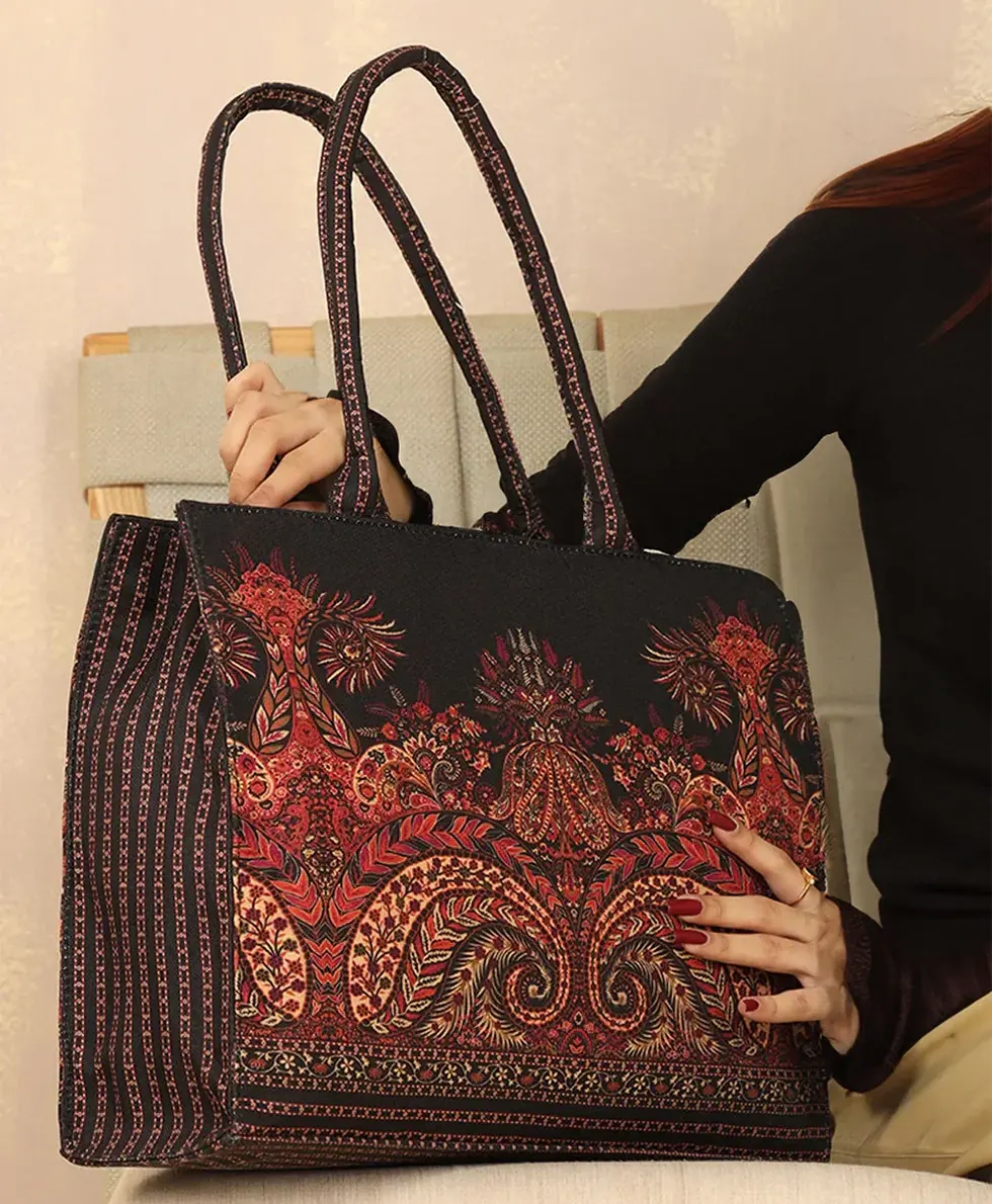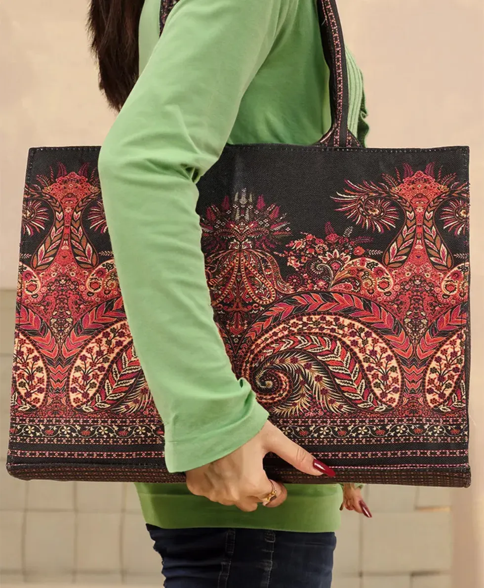 This premium canvas tote bag is designed for women who love classy, artistic, and floral styles. Make a sophisticated statement with this stunning boho tote bag, featuring an intricate paisley and floral print in rich red, gold, and black hues. Designed for women who love ethnic elegance and timeless style, this spacious and durable handbag is perfect for work, shopping, or casual outings. Each detail celebrates color, life, and effortless style. This tote offers elegant symmetrical detailing for a truly timeless and eye-catching look.