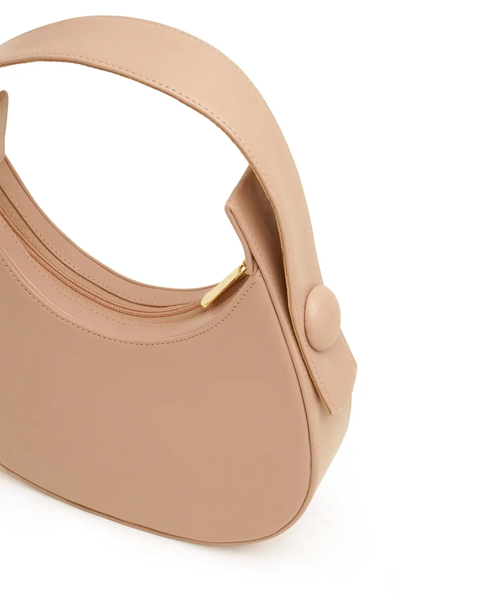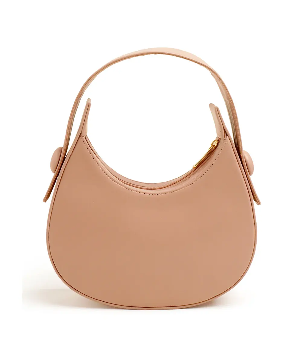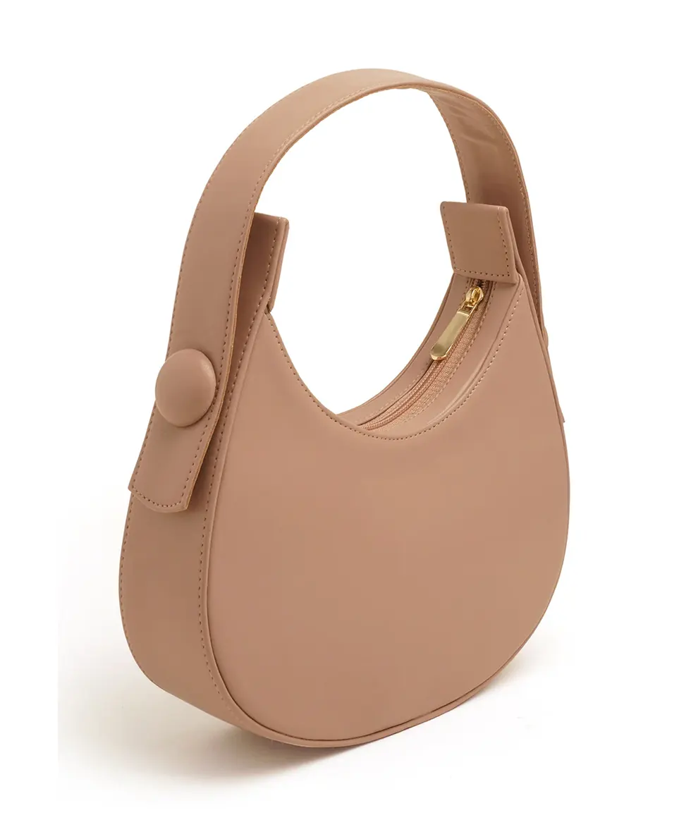 The Hobo Moon Bag in Peach features smooth PU leather with a curved silhouette and wide strap for comfortable carry. A bold button detail and gold-tone hardware elevate its minimal aesthetic, while the secure top zipper ensures practicality. Versatile enough for day or evening, it balances understated elegance with everyday functionality.